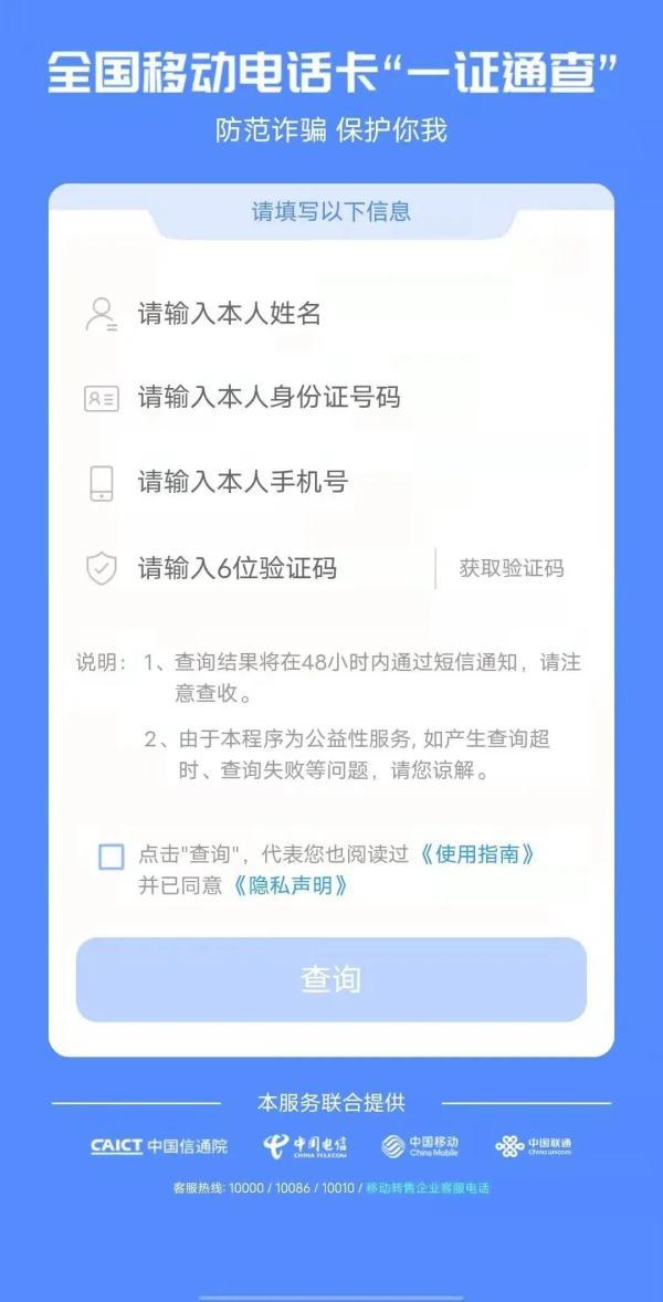 “一证通查”服务是由中国信通院、三大运营商及移动通信转售企业共同推出的公益性查询服务,可以为用户提供本人在各个运营商通过居民身份证办理的所有处于在网状态的移动电话卡数量。此次,云闪付与中国信通院合作推出“一证通查”服务,为人民群众维护自身利益、保护个人信用提供了有效途径,将助力打击电信网络诈骗工作。用户通过云闪付APP首页搜索“一证通查”,一键进入查询页面,按照页面提示输入相应信息即可。如对查询到的电话卡情况有异议,可通过对应的电信企业查询明细信息,并进行相应处理。
