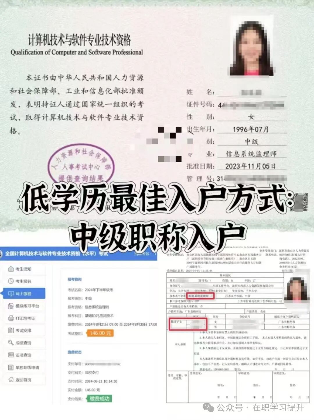 落户深圳:满足中级职称(信息系统监理师证书)+中专学历+深圳社保在缴+45周岁以下,即可申请落户。
