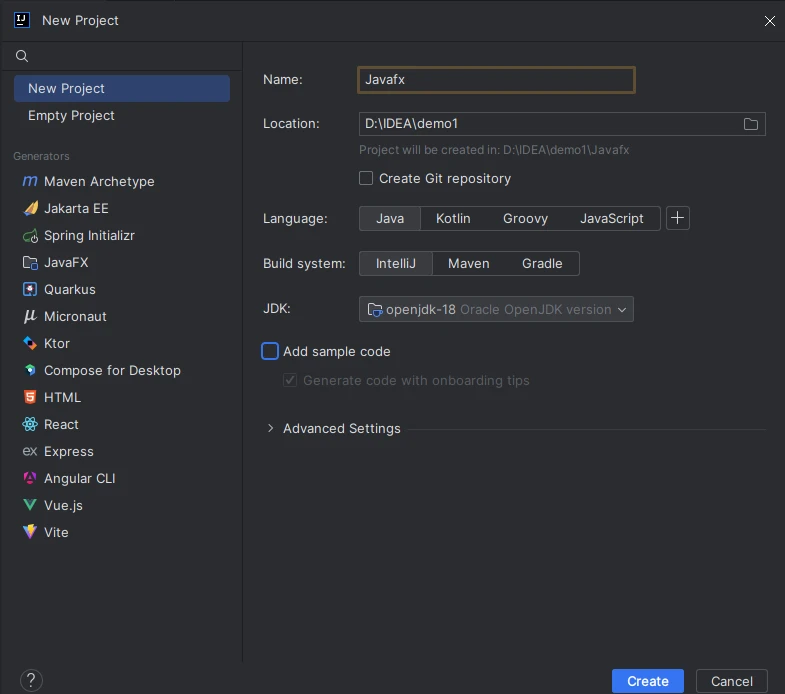 但是我这里仅仅向大家介绍如何从一个空项目中构建JavaFX的程序。