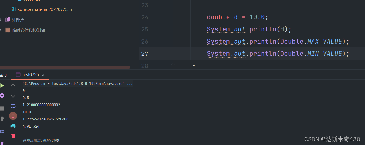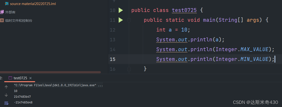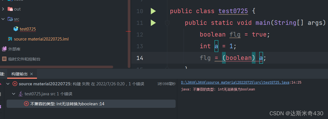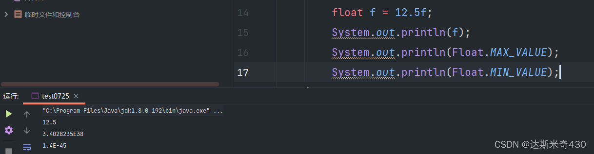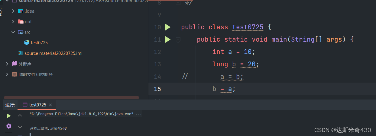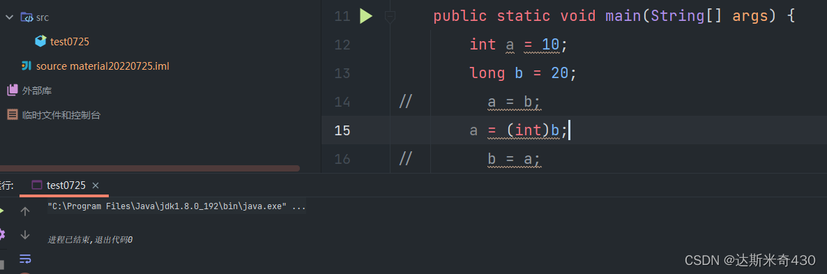 1.int四个字节, 不过多少位操作系统,都是四个字节 说明可移植性强 2.java 中的 int 没有所谓的无符号整形, 统一都是有符号的 3.取值范围 -2^31~(2^31)-1 4.变量的命名:小驼峰 -》 数字,字母,下划线,美元符号 组成的 不能数字开头 5.变量可不可以不初始化? 不可以,java比较安全,如果不初始化就使用,编译器就不是警告 6.java使用Unicode字符集 不仅可以使用英文,还支持更多其他国家的语言 7.java里面没有 0是假 非0是真 true是真,false是假 强制类型转换注意事项: 1. 不同数字类型的变量之间赋值, 表示范围更小的类型能隐式转换成范围较大的类型 2. 如果需要把范围大的类型赋值给范围小的, 需要强制类型转换, 但是可能精度丢失 3. 将一个字面值常量进行赋值的时候, Java 会自动针对数字范围进行检查 4. 强制类型转换不一定能成功,不相干的类型不能互相转换 强制类型转换(显式) * 强制类型转换:当进行操作时,代码需要经过一定的格式处理,不能自动完成。特点:数据范围大的到数据范围小的。 自动类型转换(隐式) * 自动类型转换即:代码不需要经过任何处理,在代码编译时,编译器会自动进行处理。特点:数据范围小的转为数据范围大的时会自动进行。 * 不同类型的数据之间相互运算时,数据类型小的会被提升到数据类型大的。(整形提升)