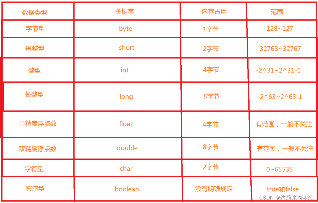 因为java中没有无符号整形的说法,所以他和byte是一个样子,第一位数字表示他的正负,后面的数字是他的取值范围,这个图太长了,就不画了,和前面一个样子,懂就行。