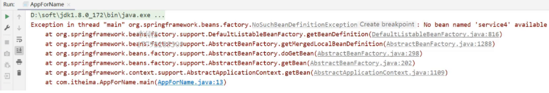 - 获取bean无论是通过id还是name获取,如果无法获取到,将抛出异常NoSuchBeanDefinitionException