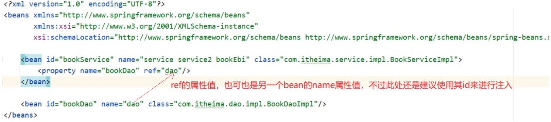 - bean依赖注入的ref属性指定bean,必须在容器中存在