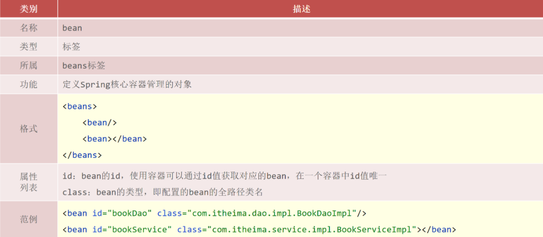 其中,bean标签的功能、使用方式以及id和class属性的作用,我们通过一张图来描述下