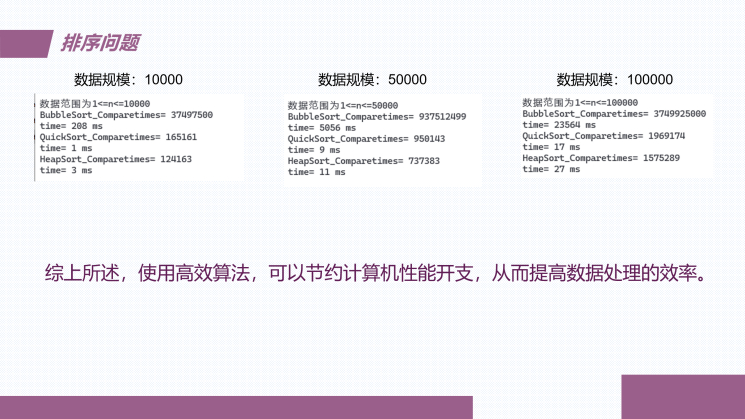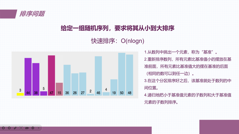接着,为了加深同学们对算法作用的理解,钟启涛同学详细阐述了四种排序算法——冒泡排序、选择排序、归并排序及快速排序。