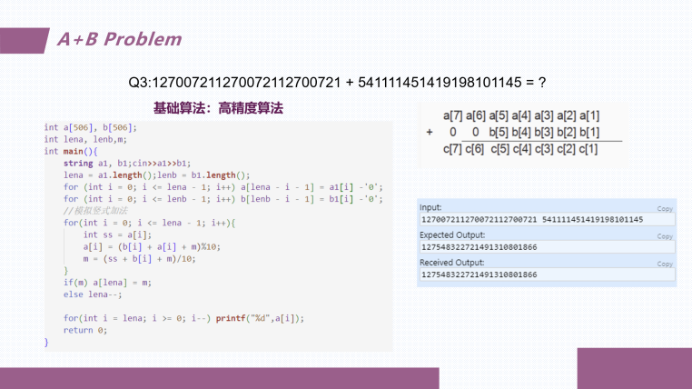 首先,钟启涛同学以经典的“A+B问题”为例,展示了高精度算法如何化繁为简,将无解难题变为可解。这个例子深刻说明了算法作为解决问题的强大工具,能够突破计算限制,展现人类智慧的无限可能。