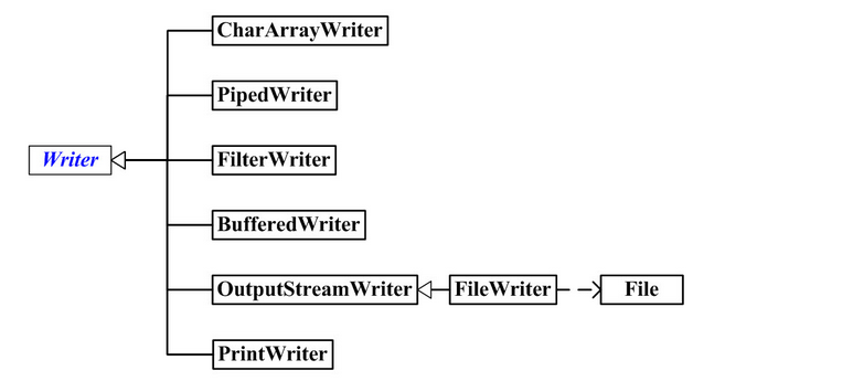 - CharArrayWriter、StringWriter 是两种基本的介质流,它们分别向Char 数组、String 中写入数据。PipedWriter 是向与其它线程共用的管道中写入数据