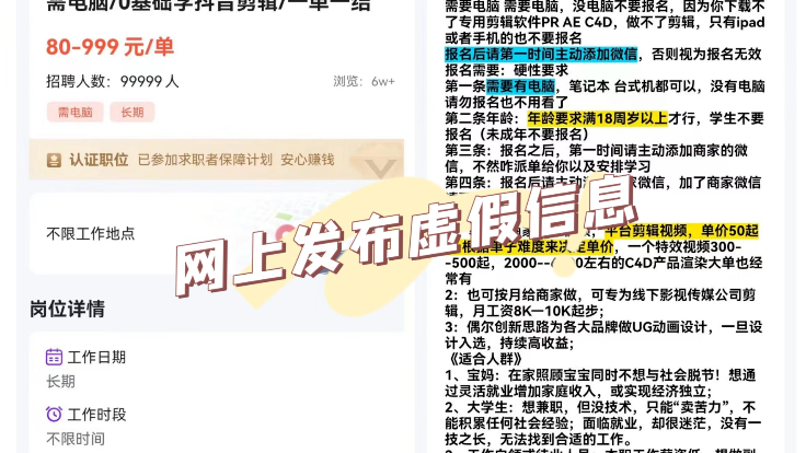 在这种骗局中,犯罪团伙通过网络兼职平台发布虚假的兼职广告,承诺“完成9节剪辑课程后可以到外包接单群赚钱”,并伪造“成功案例”,诱骗受害人分期购买视频剪辑培训课程。在受害人学习课程期间,该团伙伪造虚假订单在群内派送以稳住受害人。当受害人完成培训后,不法分子则会以“培训积分不够”等各种理由搪塞,受害人根本没有兼职接单的机会。