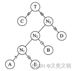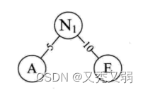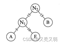 2.在所有数据中,除了选择过的叶子节点(A5,E10),加上新生成的根(15)中,比较大小,再选出最小的。也就是在原有数据中用N1替代A和E。