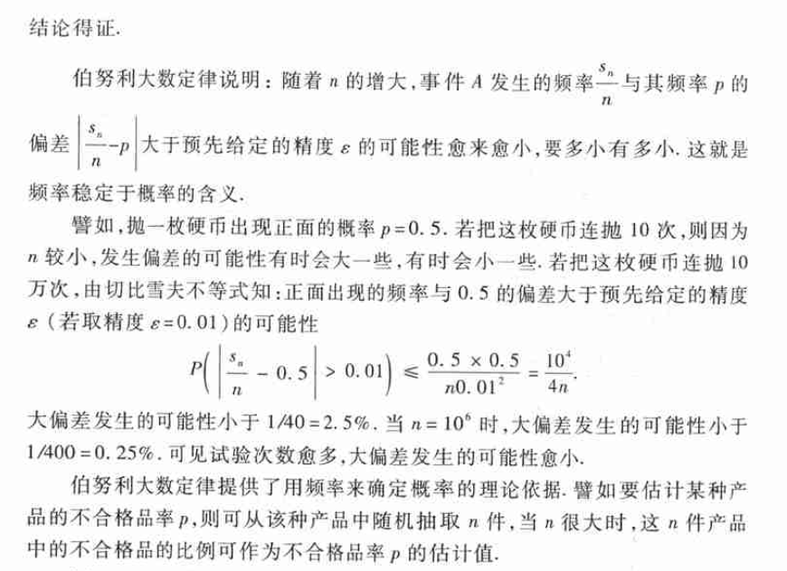 随机事件的概率是对大量的重复试验中随机事件的频率具有稳定性这一客观规律抽象的结果。实际上,不仅仅是随机事件的频率具有稳定性,大量随机现象的平均结果一般也具有稳定性,即不论个别随机现象的结果以及它们在进行过程中的个体特征如何,大量随机现象的平均结果与各个随机现象的特征无关。概率论中用来阐述大量随机现象平均结果的稳定性的理论称为大数定律。