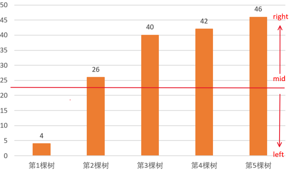 所以可以通过分治法(利用二分法查找的原理)来解决这个问题(并非传统的分治,我们考虑从最高的一棵树入手,对齐进行分治,来找寻解决方案)