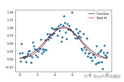 讯享网import numpy as np from scipy.optimize import curve_fit import matplotlib.pyplot as mpl # Let's create a function to model and create data def func(x, a, x0, sigma): return a*np.exp(-(x-x0)2/(2*sigma2)) # Generating clean data x = np.linspace(0, 10, 100) y = func(x, 1, 5, 2) # Adding noise to the data yn = y + 0.2 * np.random.normal(size=len(x)) # Plot out the current state of the data and model fig = mpl.figure() ax = fig.add_subplot(111) ax.plot(x, y, c='k', label='Function') ax.scatter(x, yn) # Executing curve_fit on noisy data popt, pcov = curve_fit(func, x, yn) #popt returns the best fit values for parameters of the given model (func) print (popt) ym = func(x, popt[0], popt[1], popt[2]) ax.plot(x, ym, c='r', label='Best fit') ax.legend() fig.savefig('model_fit.png')