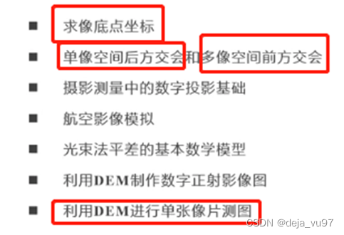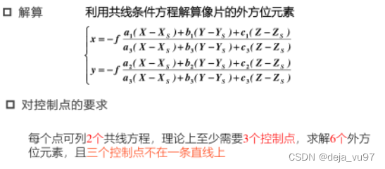 ②解算方位元素(空间后方交会):6个未知数,一个控制点可列2个方程,需要至少三个控制点