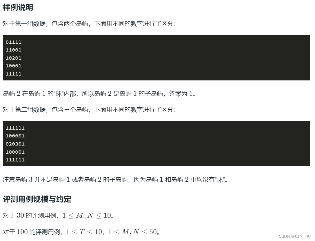 import java.util.ArrayList; import java.util.LinkedList; import java.util.Queue; import java.util.Scanner; //Pos的作用类似c++的结构体,存储点的坐标 class Pos { int x, y; public Pos(int x, int y) { this.x = x; this.y = y; } } public class Main { public static void main(String[] args) { Scanner scan = new Scanner(System.in); // 读取测试用例数量 int t = scan.nextInt(); // 遍历每个测试用例 while (t-- > 0) { // 读取岛屿的行数和列数 int m = scan.nextInt(); int n = scan.nextInt(); // 初始化岛屿数量 int ans = 0; // 岛屿矩阵和访问标记矩阵 int[][] island = new int[m][n]; boolean[][] visited = new boolean[m][n]; // BFS 队列 Queue<Pos> queue = new LinkedList<>(); // 存储每个岛屿的第一个点的位置 ArrayList<Pos> firstPos = new ArrayList<Pos>(); // 方向数组:上、右、下、左 int[] dx = {-1, 0, 1, 0}; int[] dy = {0, 1, 0, -1}; // 读取岛屿矩阵 注意题目输入的数字是连着的,所以要用字符串读入后拆分 for (int i = 0; i < m; i++) { char[] str = scan.next().toCharArray(); for (int j = 0; j < n; j++) { island[i][j] = str[j] - '0'; } } // 遍历岛屿矩阵 for (int i = 0; i < m; i++) { for (int j = 0; j < n; j++) { // 如果当前位置未访问且为岛屿 if (visited[i][j] == false && island[i][j] == 1) { // 岛屿数量加一 ans++; // 存储第一个点的位置 firstPos.add(new Pos(i, j)); // 将第一个点入队列,开始 BFS queue.offer(new Pos(i, j)); visited[i][j] = true; while (!queue.isEmpty()) { Pos pos = queue.poll(); // 遍历上、右、下、左四个方向 for (int k = 0; k < 4; k++) { int x = pos.x + dx[k]; int y = pos.y + dy[k]; // 判断新位置是否在合法范围0~n-1和0~m-1内,并且为未访问的岛屿点 if (x >= 0 && x < m && y >= 0 && y < n && island[x][y] == 1 && !visited[x][y]) { visited[x][y] = true; queue.offer(new Pos(x, y)); } } } } } } // 接下来从每个岛的第一个点的上方一个点(由遍历方式易得这个点一定是海水)开始遍历海水 // 只要能遍历到边界就说明不是子岛屿 // 方向数组:上、右上、右、右下、下、左下、左、左上 int[] dxSea = {-1, -1, 0, 1, 1, 1, 0, -1}; int[] dySea = {0, 1, 1, 1, 0, -1, -1, -1}; // 遍历存储的每个岛屿的第一个点的位置 outer: for (Pos pos : firstPos) { boolean[][] visitedSea = new boolean[m][n]; // 如果该岛屿的第一个点在边界上,直接跳过 if (pos.x == 0 || pos.x == m - 1 || pos.y == 0 || pos.y == n - 1) { continue; } queue.clear(); queue.offer(new Pos(pos.x - 1, pos.y)); while (!queue.isEmpty()) { Pos posNow = queue.poll(); // 如果海的点到达边界,说明不是子岛屿,跳到外循环 if (posNow.x == 0 || posNow.x == m - 1 || posNow.y == 0 || posNow.y == n - 1) { continue outer; } // 遍历左上、上、右上、右、右下、下、左下、左八个方向 for (int k = 0; k < 8; k++) { int x = posNow.x + dxSea[k]; int y = posNow.y + dySea[k]; // 判断新位置是否在合法范围内,并且为未访问的海点 if (x >= 0 && x < m && y >= 0 && y < n && island[x][y] == 0 && !visitedSea[x][y]) { visitedSea[x][y] = true; queue.offer(new Pos(x, y)); } } } // 遍历完整个岛都没有接触到边界,说明是子岛屿,不合题意 // 岛屿数量减一 ans--; } // 输出结果 System.out.println(ans); } // 关闭输入流 scan.close(); } }