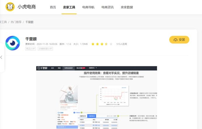 千里眼插件是一款可以直观展示淘宝官网搜索页面上每个宝贝的上下架时间、PC端在线人数、宝贝的关键词排名、展现量、点击量,宝贝的价格变化曲线等汇总数据的电商工具。