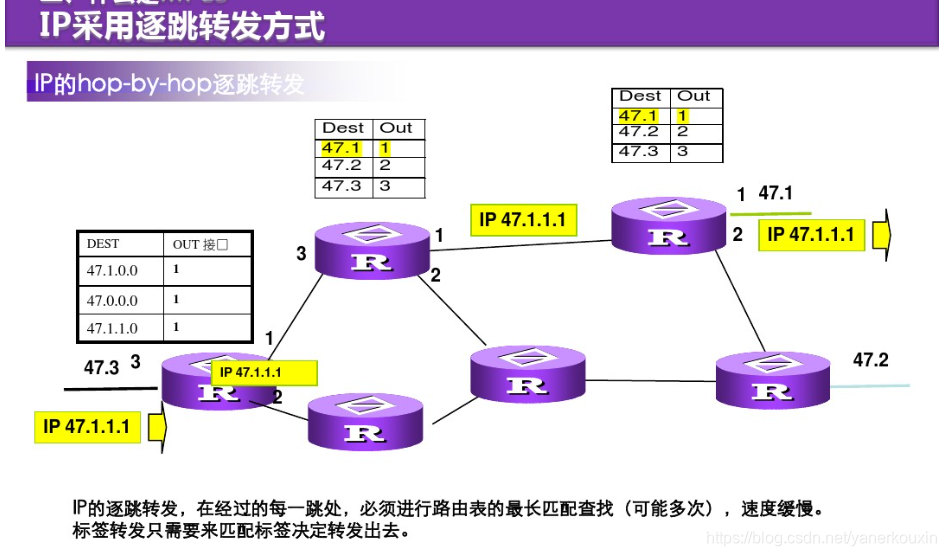 逐跳转发是指,数据包经由路由节点是,逐跳在路由表判断,随着网络扩大,路由表变得异常庞大,匹配判断需要花大量时间。