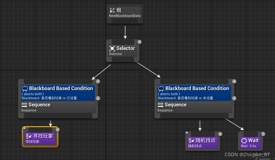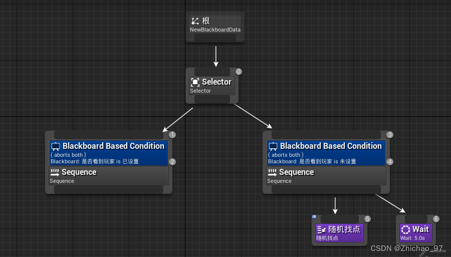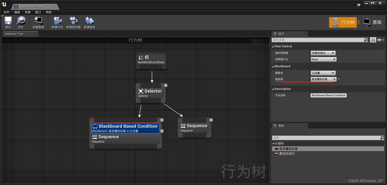 13.双击打开AI行为树,创建如下节点,表示AI看到玩家就走左边的Sequence否则走右边