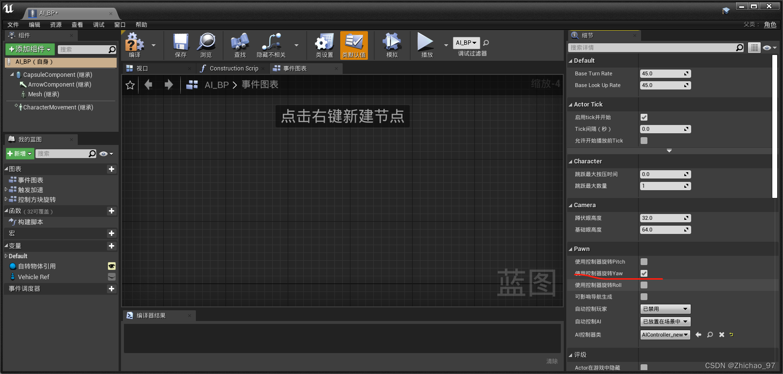 32.在类默认值中,细节面板勾选 使用控制器旋转Yaw