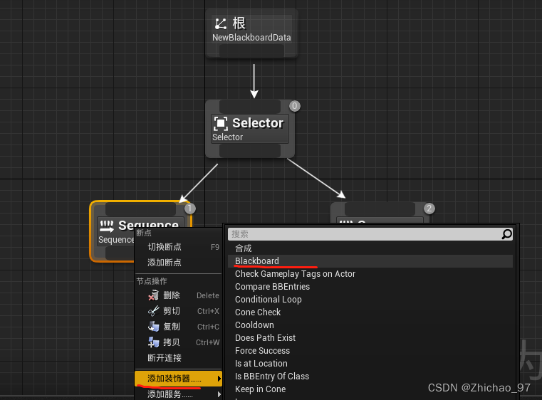 14.右键点击Sequence,选择添加装饰器-》黑板,这样是为了能够调用黑板中的变量