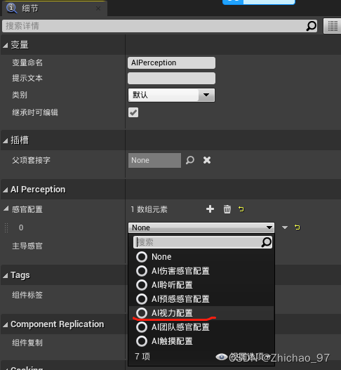 7.双击打开AIController_new,点击添加组件-》AI感知组件,用来感知AI周围是否有玩家或其它东西