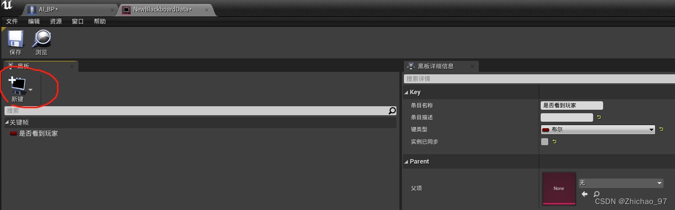 5.双击打开黑板,点击新建,创建一个布尔值,命名为是否看到玩家
