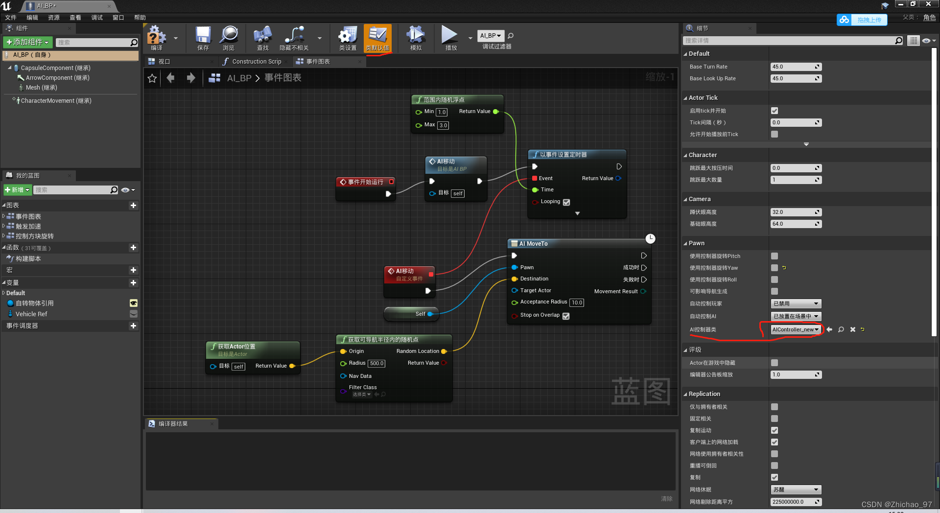 12.打开AI_BP ,点击类默认值,在细节面板中 AI控制器类选择为AIController_new