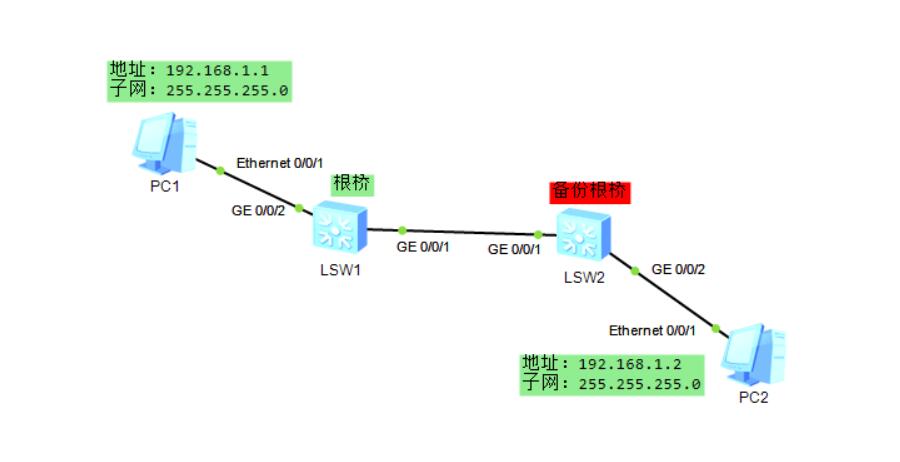 接下来通过一个具体的实例,来完成生成树的配置命令和配置流程的实践,以下实验我们将把LSW1(三层交换)配置成根桥,将LSW2(二层交换)配置为备份根桥,实验拓扑结构如下图: