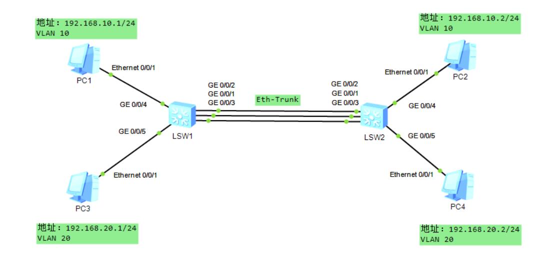 #----在LSW1上操作------------------------- [LSW1] vlan batch 10 20 // 创建VLAN10与20 [LSW1] interface GigabitEthernet 0/0/4 // 选择Gig0/0/4端口 [LSW1-GigabitEthernet0/0/4] port link-type trunk // 配置成trunk [LSW1-GigabitEthernet0/0/4] port trunk allow-pass vlan 10 // 应用到vlan10 [LSW1-GigabitEthernet0/0/4] quit [LSW1] interface GigabitEthernet 0/0/5 [LSW1-GigabitEthernet0/0/5] port link-type trunk [LSW1-GigabitEthernet0/0/5] port trunk allow-pass vlan 20 [LSW1-GigabitEthernet0/0/5] quit #----在LSW2上操作------------------------- [LSW2] vlan batch 10 20 [LSW2] interface GigabitEthernet 0/0/4 [LSW2-GigabitEthernet0/0/4] port link-type trunk [LSW2-GigabitEthernet0/0/4] port trunk allow-pass vlan 10 [LSW2-GigabitEthernet0/0/4] quit [LSW2] interface GigabitEthernet 0/0/5 [LSW2-GigabitEthernet0/0/5] port link-type trunk [LSW2-GigabitEthernet0/0/5] port trunk allow-pass vlan 20 [LSW2-GigabitEthernet0/0/5] quit