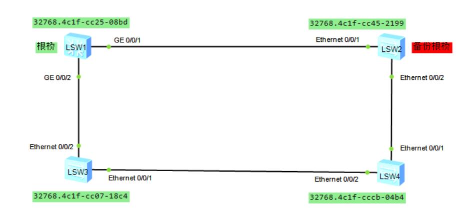 <LSW1> display stp // 判断根桥命令 <LSW2> display stp <LSW3> display stp <LSW4> display stp -------[CIST Global Info][Mode MSTP]------- CIST Bridge :32768.4c1f-cc25-08bd // 本机优先级 Config Times :Hello 2s MaxAge 20s FwDly 15s MaxHop 20 // 数据包发送时间 Active Times :Hello 2s MaxAge 20s FwDly 15s MaxHop 20 CIST Root/ERPC :32768.4c1f-cc07-18c4 / 20000 // 根桥MAC地址 CIST RegRoot/IRPC :32768.4c1f-cc25-08bd / 0 // 备份根桥MAC地址 <LSW1> display stp brief // 查询接口状态 MSTID Port Role STP State Protection 0 GigabitEthernet0/0/1 DESI FORWARDING NONE 0 GigabitEthernet0/0/2 ROOT FORWARDING NONE