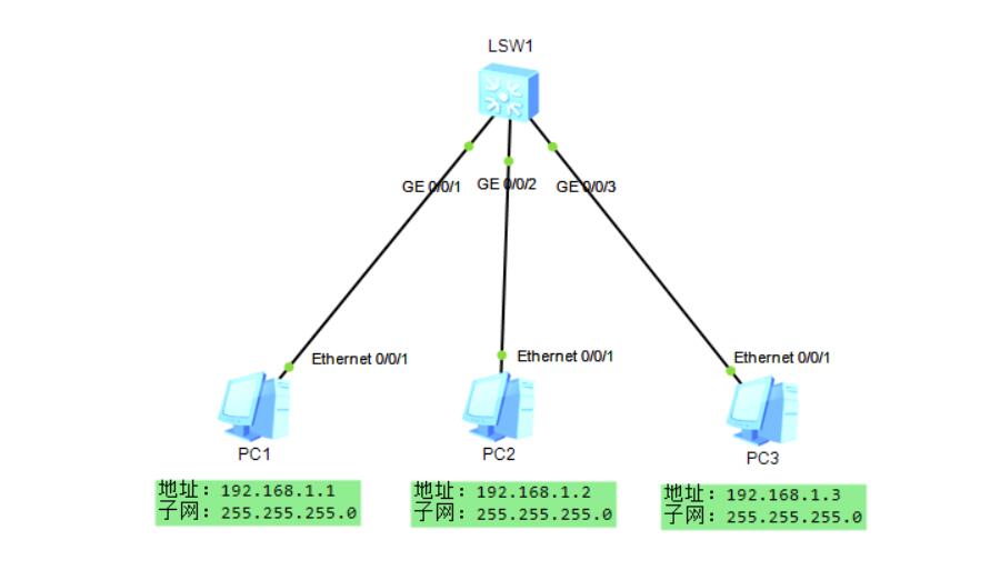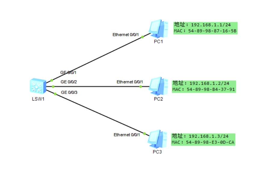 接下来看一个具体的实例,来实现端口安全的配置,包括端口绑定端口违规的处理等,实验拓扑图参数如下: