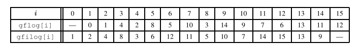 根据上文的GF(24)的元素表示,生成gflog表和gfilog表如下: