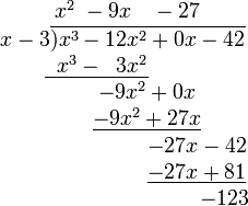 使用长除法。例如计算x3-12x2-42,除以x-3。使用长除法计算,商x2-9x-27,余数-123。