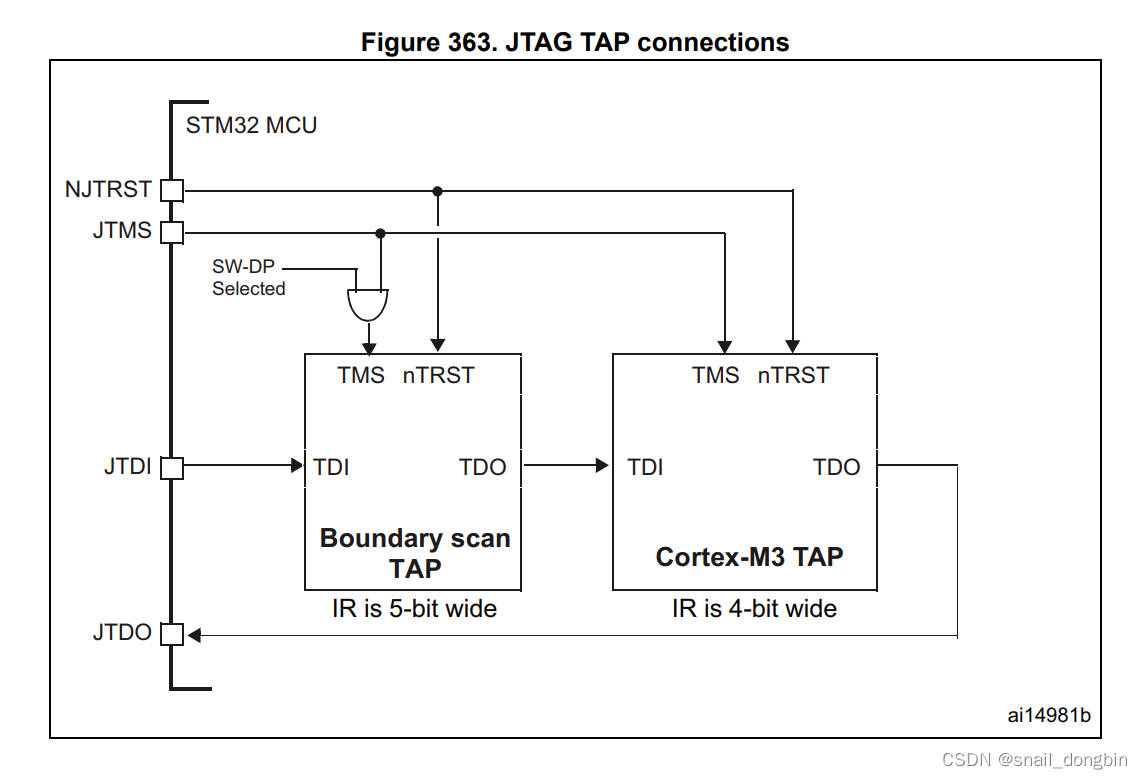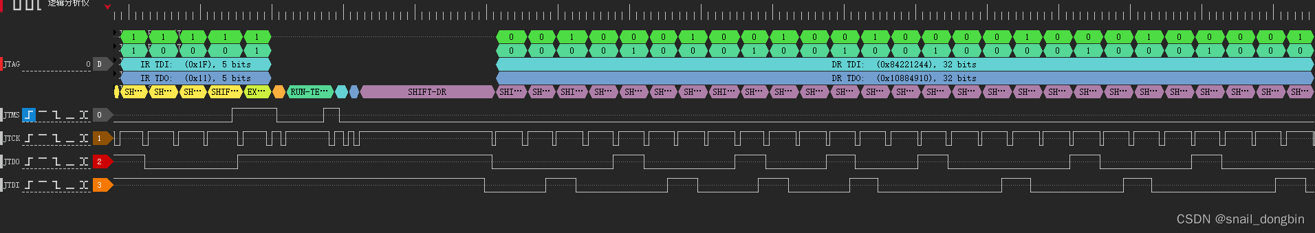 再仔细看手册,原来STM32内部可不是一个TAP控制器,还有个SWD的,要两个时钟才能移出原数据,这下对上了。