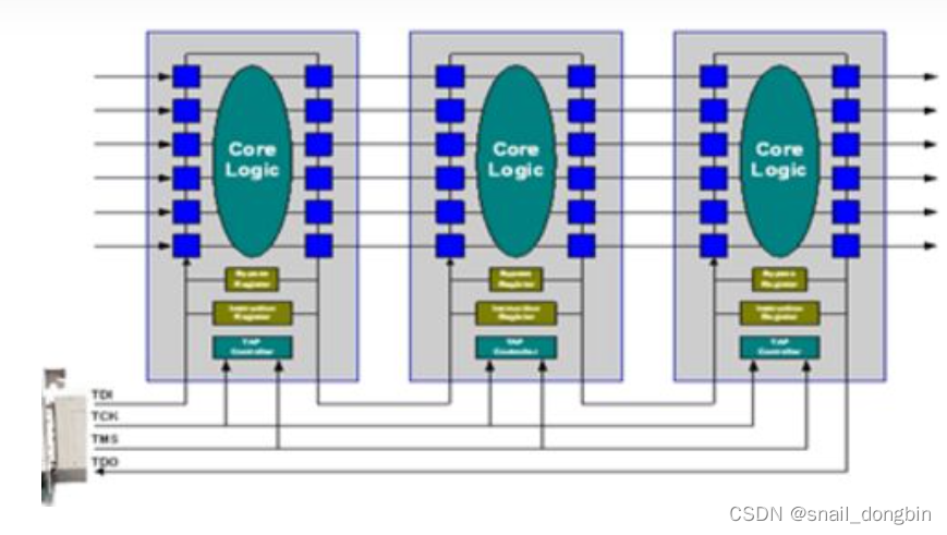 如上图,如果一个芯片的引脚很多,用的还是BGA封装,那么传统方法将无法扎针测量,于是测试人员就想起来了,在芯片内部设计一个移位电路,将所有引脚的状态通过移位方式读出来。那么这样就可以用很小的成本实现可测性。只需两个引脚TDI TDO.