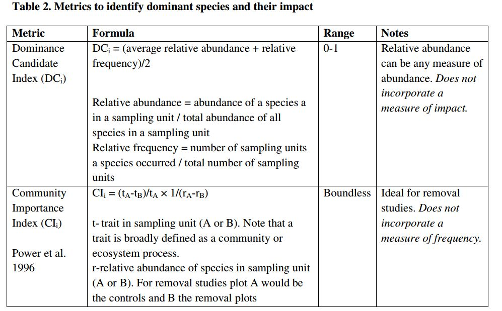 下面将描述每一个指标,并建议修改IVi指标为dominance candidate index (DCi),然后测试了结合DCi和CIi指标通过观察和实验数据识别优势物种的有效性。