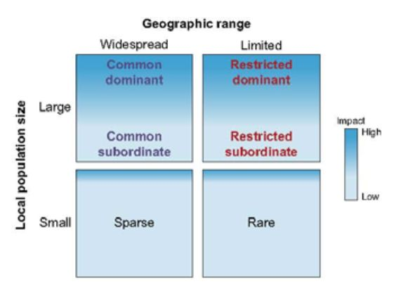 这个定义涵盖了一个物种在当地的相对丰度、它在景观中的普遍性、以及它对群落和生态系统属性的影响。