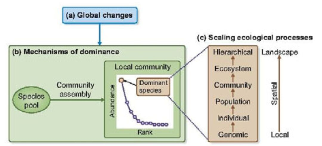 由于优势物种的高度丰富性,通常分布广泛,以及对群落和生态系统过程的影响,作者建议优势物种作为理解全球变化对生态过程影响的关键,如下图所示。