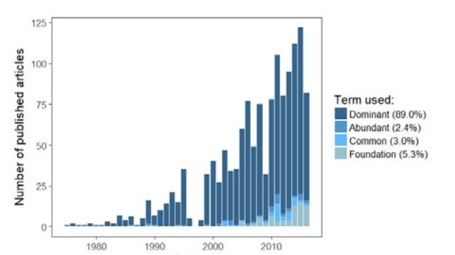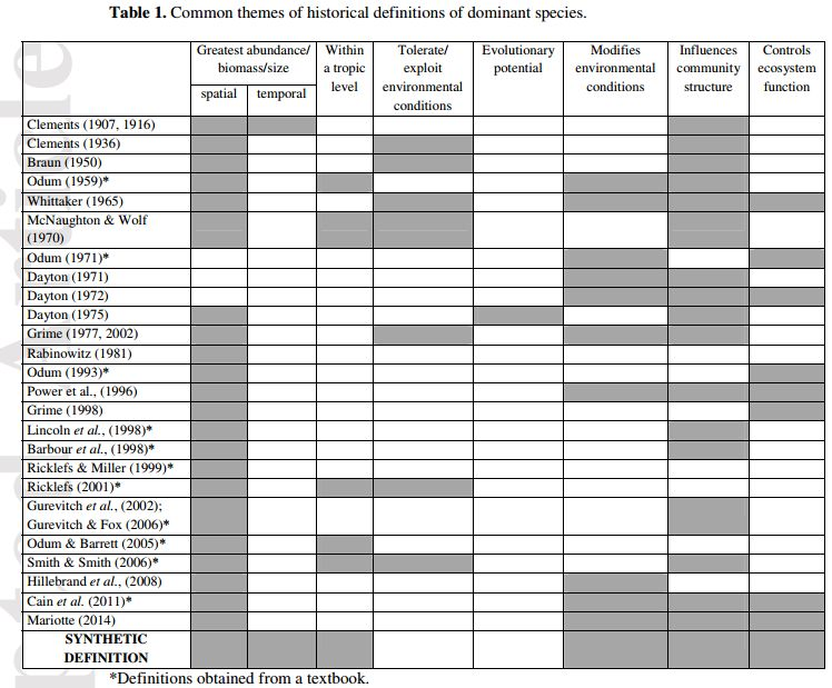 作者对以往的定义进行汇总发现,生态学家对这一概念的定义存在相当大的差异。调查的大多数优势物种定义始终包括高丰度,有些还提到对群落和周围环境条件的影响,但很少包括生态系统水平的影响。