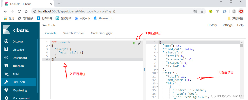 - 点击左侧菜单“Dev Tools”就可以访问 ElasticSearch的控制台