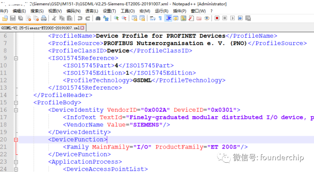 PROFINET系统使用XML语言来描述GSD文件。XML是Extensible Markup Language的缩写,即"可扩展标记语言"。它是在HTML语言的基础上,增加了可扩展的标签,适合于数据交换。PROFINET的GSD文件使用XML语言描述,因此该文件也称为GSDML文件,它的后缀名为 .xml,可以用任何文本编辑器打开。下面这张图是西门子ET200S家族中IM151-3的GSD文件截图: