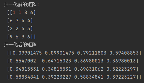 from sklearn import preprocessing import numpy as np data = np.random.randint(1,10,(4,4)) data_normalized = preprocessing.normalize(data)#将矩阵的每行都执行归一化操作 print('归一化前的矩阵:\n',data) print('归一化后的矩阵:\n',data_normalized)