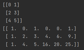 讯享网# 多项式特征(不同于对特征列进行操作,这个是对行进行操作的) from sklearn.preprocessing import PolynomialFeatures import numpy as np x = np.arange(6).reshape(3, 2) X = PolynomialFeatures(2).fit_transform(x) print(x) print(X)