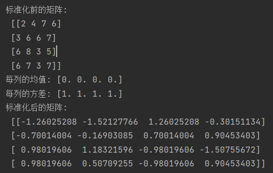 # preprocessing模块用于数据预处理和特征工程的相关操作 from sklearn import preprocessing import numpy as np data = np.random.randint(1, 10, (4, 4))#随机生成一个4x4的数组,其中的元素从1-10中选取 print('标准化前的矩阵:\n',data) data_scaled = preprocessing.scale(data)#对数据进行均值化处理,使得每类的均值为0,方差为1 d_mean = data_scaled.mean(axis=0).round(2)#计算每列的均值 d_std = data_scaled.std(axis=0).round(2)#计算每列的方差 print('每列的均值:',d_mean) print('每列的方差:',d_std) print('标准化后的矩阵:\n',data_scaled)