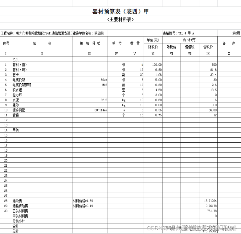 表4:材料的合计值=数量X单价,然后计算全部材料合计值,运杂费=材料的合计值X1.8%