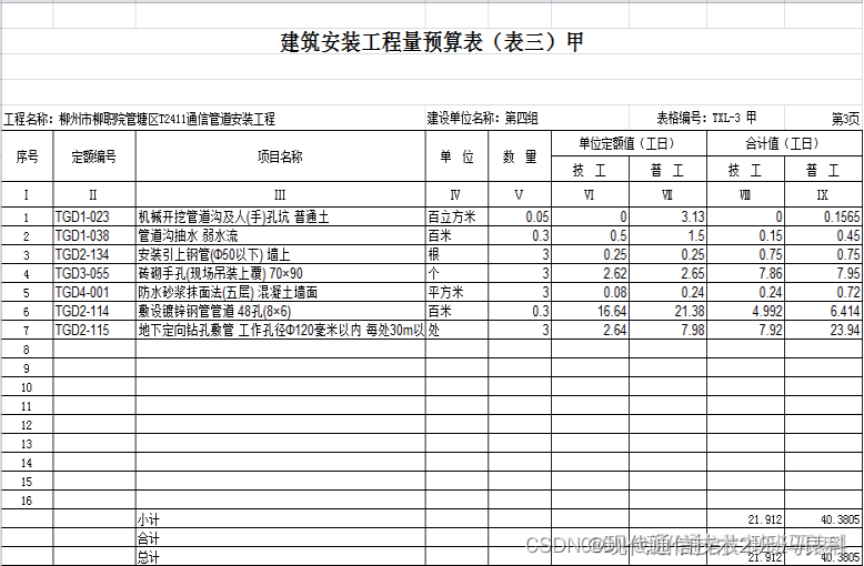 表1:单个项目的技工合计工日(VIII):数量(V)X技工的单价定额(VI) 单个项目的普工合计工日(IX):数量(V)X普工的单价定额(VII),然后再分别计算的技工和普工的合计工日