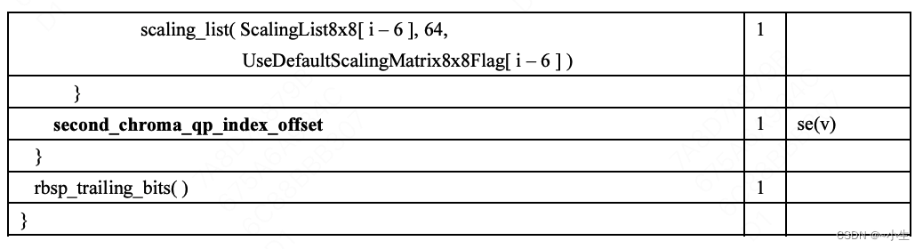 (26)second_chroma_qp_index_offset:表示为在QPC值的表格中寻找Cr色度分量而应加到参数 QPY和QSY上的偏移。second_chroma_qp_index_offset的值应在-12到+12范围内(包括边界值)。当 second_chroma_qp_index_offset不存在时,默认其值等于chroma_qp_index_offset。
