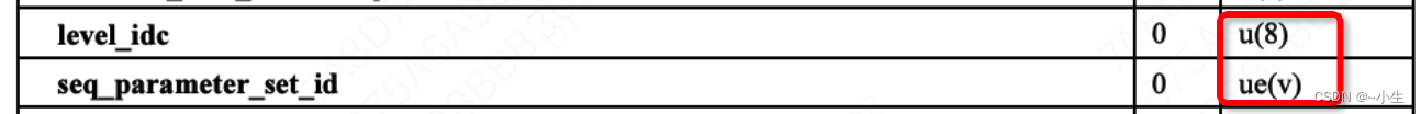 在官方文档的描述中,如果第三列是ue(v)或se(v)字样,则说明对应字段的数据经过编码,读到数据之后需要先解码,然后才能获得真实的数据。如果第三列是u(8),则说明此字段没有经过编码,读取的数据就是原始数据。如下图所示,level_idc没有经过编码,seq_parameter_set_id经过了编码。