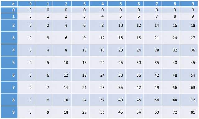 同样,当你想将两个十进制数相乘的时候,方法可能稍微复杂些,但是你仍然只需要将问题分解成几步,做加法和一位数的乘法即可。在你的小学时代你一定也被要求必须记住下面的乘法表。
