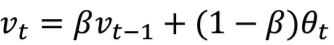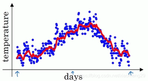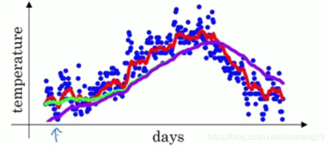 可以发现,当前的滑动平均值受前面所有温度的影响,其中时间点越近影响越大。这也说明了为什么滑动平均值比较平稳,因为其实综合之前所有历史记录的值。