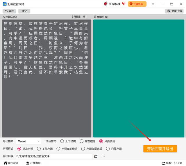 第四步:点击“开始注音并导出”按钮,软件将开始对内容进行拼音转化